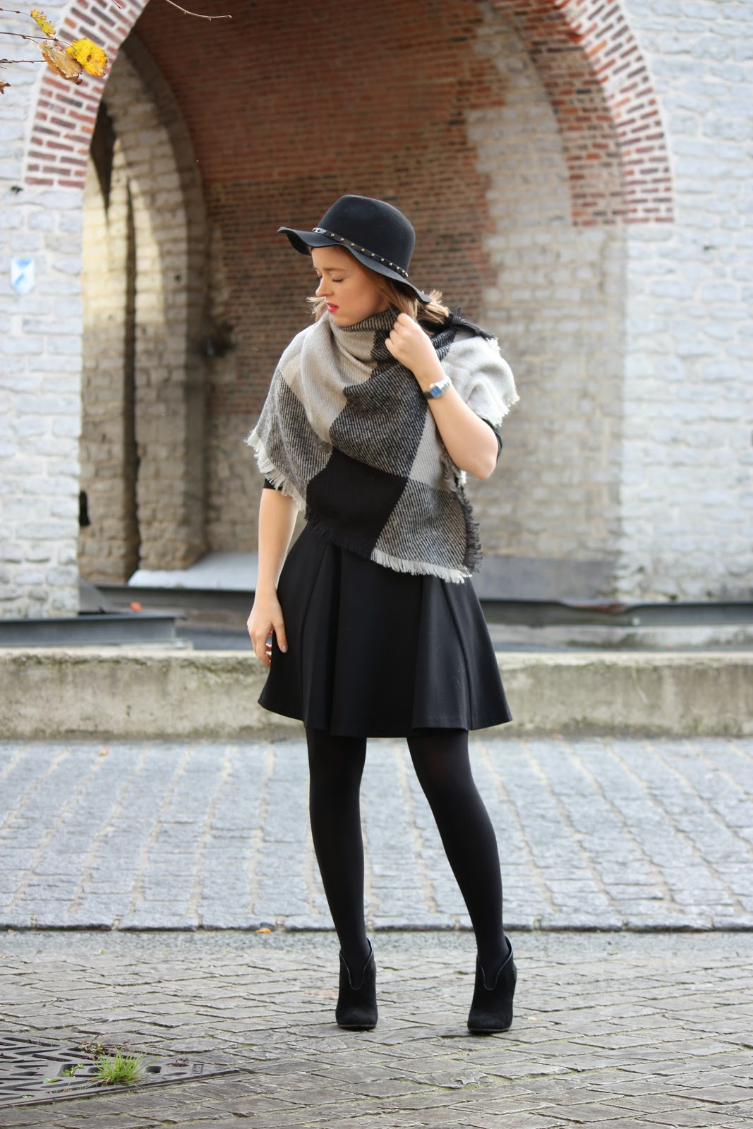 Pinko black dress / Vila checked scarf / Veritas felt hat / Lotus watch / Guess boots (similar here)